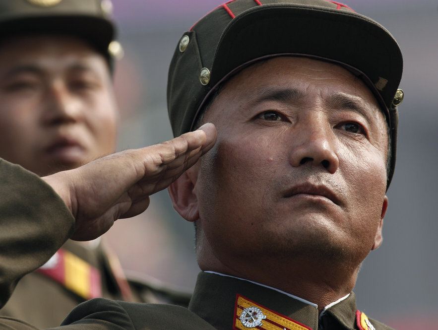 | Um soldado norte-coreano saúda enquanto marcha em uma enorme parada militar marcando o 65º aniversário do Partido dos Trabalhadores em Pyongyang, Coréia do Norte, em 10 de outubro de 2010. (Foto: Vincent Yu/AP) |